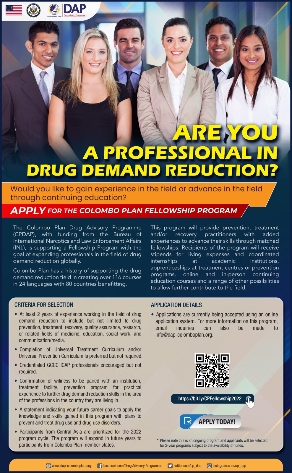 The Colombo Plan Drug Advisory Programme (CPDAP), with funding from the Bureau of International Narcotics and Law Enforcement Affairs (INL), is supporting a Fellowship Program with the goal of expanding professionals in the field of drug demand reduction globally.