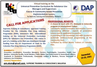 Supreme Training & Consultancy Malaysia approved Training Provider for The Colombo Plan Drug Advisory Programme (DAP), announces this international training on Course-9 Community-based Prevention Implementation Systems the Universal...