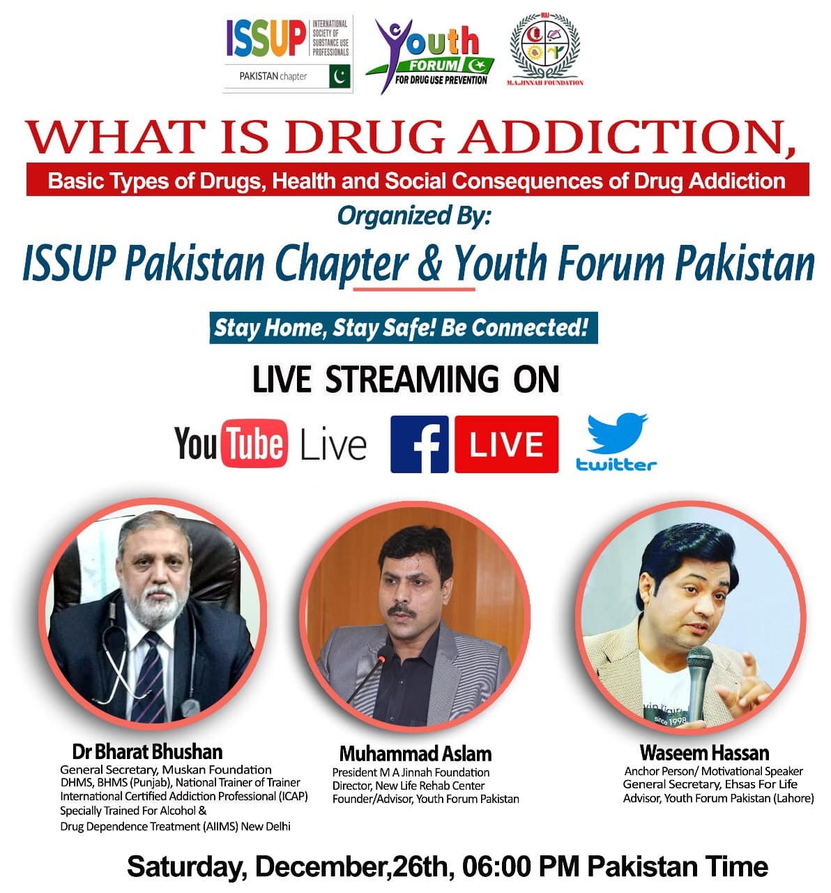 Live Session on "What is Drug Addiction, Basic Types of Drugs, Health and Social Consequences of Drug Addiction" on ISSUP Pakistan Chapter's, Youth Forum Pakistan's Facebook Page and YouTube Channels and Twitter with our honorable speaker guest Dr. Bharat Bhushan (International Certified Addiction Professional/ICAP 1, Member ISSUP, General Secretary Muskan Foundation, DHMS, BHMS Punjab, had Training of Trainers with Mr. Muhammad Aslam President M A Jinnah Foundation (Regd), Sialkot, Member ISSUP, Founder & Advisor Youth Form Pakistan (For Drug Use Prevention) and with Mr. Waseem Hassan Awan (A Renowned Anchor Person, General Secretary Ehsas For Life NGO, Advisor Youth Forum Pakistan (For Drug Use Prevention)