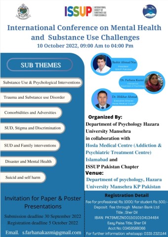 Department of Psychology Hazara - University Mansehra in collaboration with Hosla Medical Centre (Addiction & Psychiatric Treatment Centre) Islamabad and ISSUP Pakistan Chapter