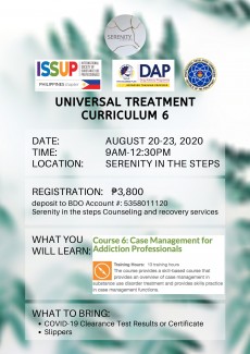 Continuing their commitment to promote the Universal Treatment Curriculum (UTC), Serenity in the Steps conducted a “Basic Counseling Skills for Addiction Professionals (UTC 4)" training session. It was delivered in a live training format with blended online components over a 10-day period. Clients of Serenity in the Steps were trained for recovery coach or peer support specialist credentials, among others, in Baguio City, Philippines. Amid the COVID-19 pandemic and with quarantine measures in place, Serenity in the Steps successfully blended online and live training techniques to approximate a...