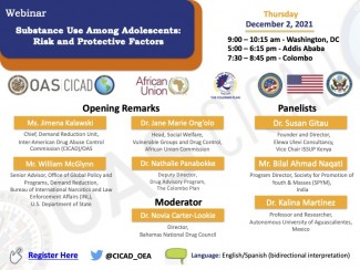 Join us for the webinar entitled, "Substance Use Among Adolescents: Risk and Protective Factors", to be held on December 2, 2021 at 9:00 am Washington, DC time. The webinar is organized by the Inter-American Drug Abuse Control Commission (CICAD), the African Union Commission and the Colombo Plan, with the support of the Bureau of International Narcotics and Law Enforcements Affairs (INL) of the U.S. Department of State.